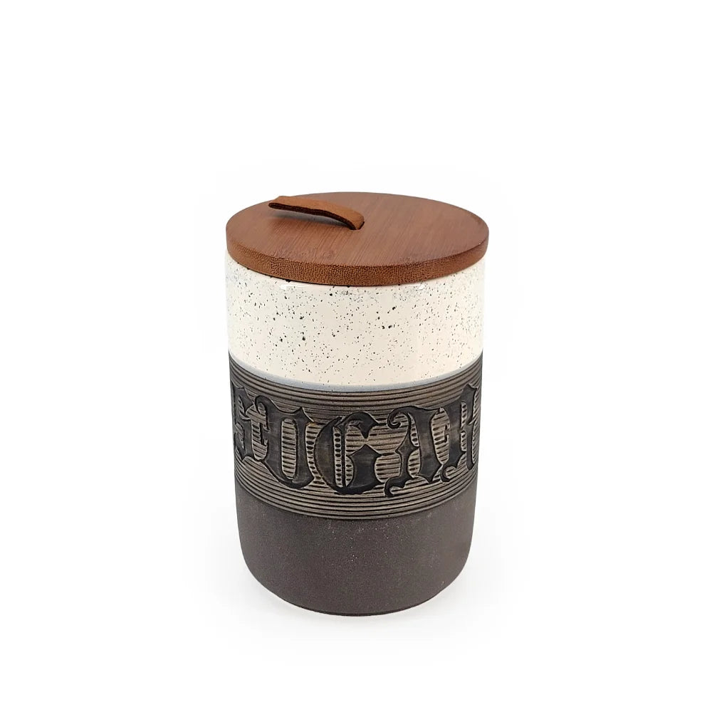 Material: Ceramic Canister, Bamboo Lid, Leather Pull Tab